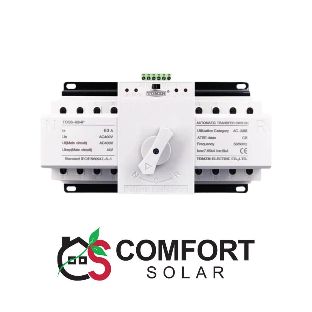 The TOMZN 4P 3 Phase 63A MCB Type Dual Power Automatic Transfer Switch (ATS) is designed to seamlessly switch between two power sources, ensuring a reliable power supply for critical applications. Suitable for 3-phase 4-wire systems, this automatic transfer device prioritizes normal power first and switches to reserve power when needed, providing an efficient and dependable solution for residential, commercial, and industrial power management.